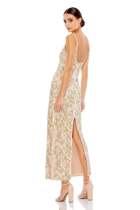Beige Polyester Crystals, Sequins, Beads Scoop Neck Floral Embellished Dress