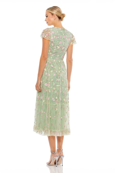 Green midi dress featuring floral embroidery with sheer ruffle cap sleeves