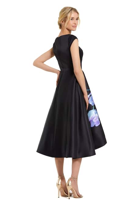 Black Polyester Boat Neck Floral Print Midi Dress