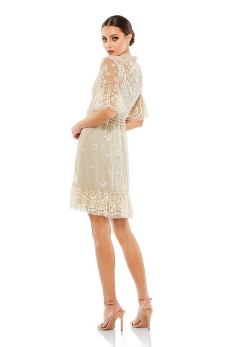 Beige sheer dress featuring sequin floral embellishments and a frilled collar