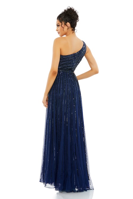 Blue gown featuring an asymmetric neckline with cascading rows of geometric embellishments