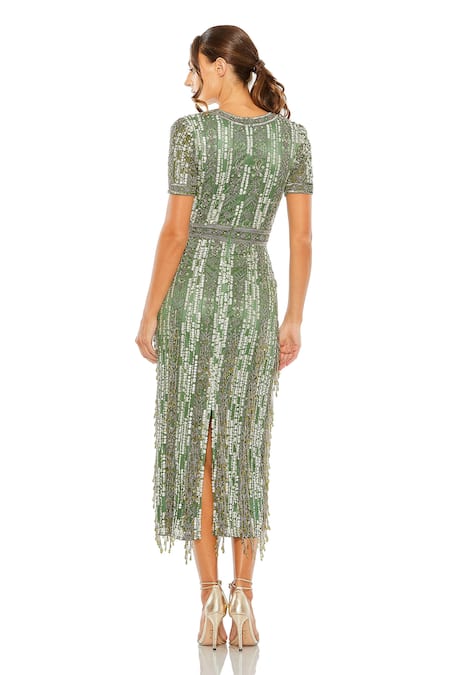 Green Polyester Sequins Round Neck Floral Art Midi Dress
