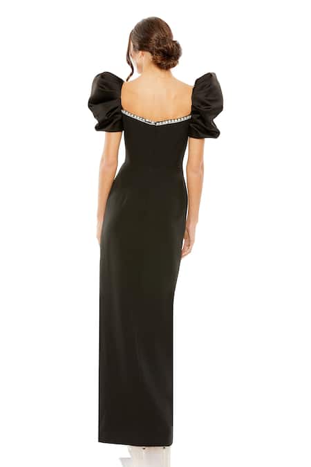 Black gown featuring a sweetheart neckline and puff sleeves with stone jewel embellishments