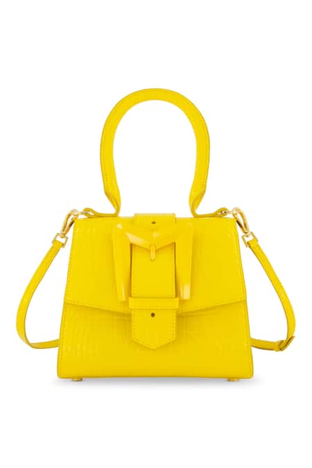 Yellow mini handbag featuring a crocodile textured embossed design with a belted flap. Includes an attached curved top handle and a detachable strap for versatility.