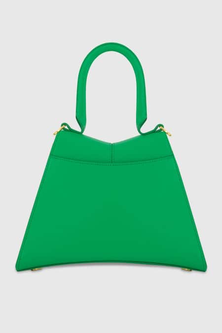 Green leather handbag featuring an angular design with a magnetic closure. Includes an attached top handle and a removable strap for versatility.