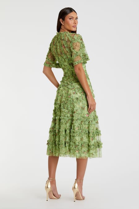 Buy_Mac Duggal_Green Polyester Collared Floral Printed Criss-cross Frill Dress _at_Aza_Fashions