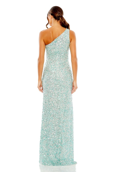Aqua blue gown featuring an asymmetric neckline and sequin hand embroidery