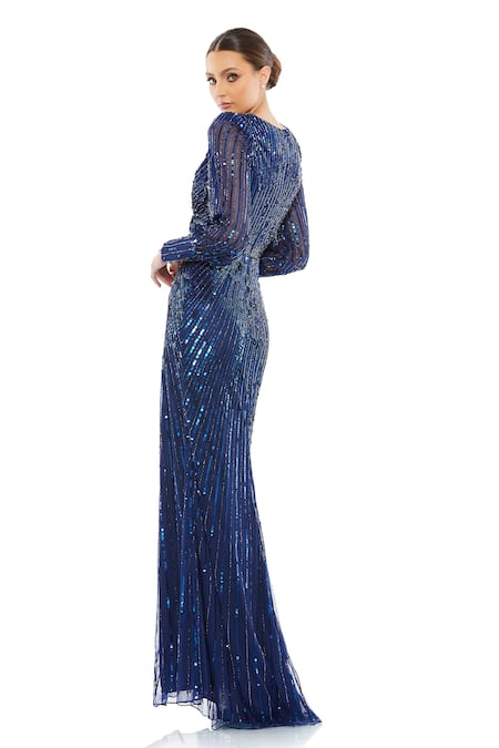 Blue gown featuring a V neck, embellished with linear sequins and beads