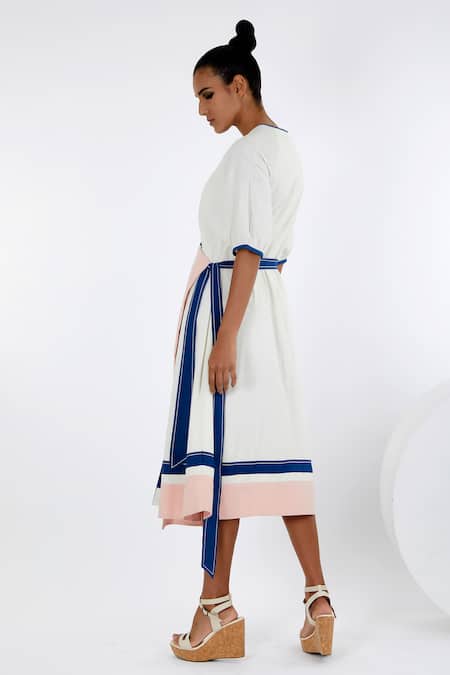 Contrast borders with stitchline thread embroidery, Side tie-up detailing, Notched neckline with front buttons