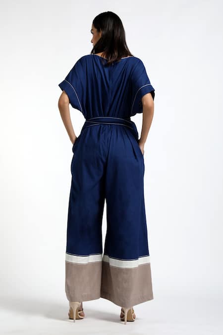 Blue cotton jumpsuit with running stitch details & contrast hem.