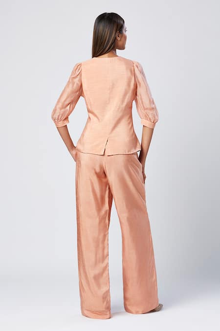 Pink Silk, Cotton V-neck Solid Waistcoat And Pant Set
