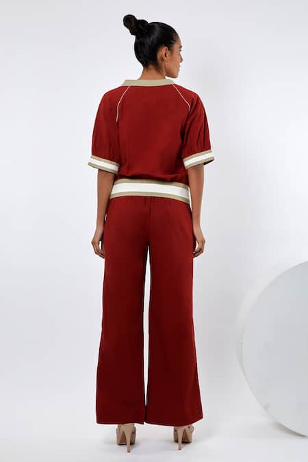 Multicolor runner top featuring a V neck, half sleeves, and stitchline embroidered border. Paired with wide-legged pants that have stripe placement print.