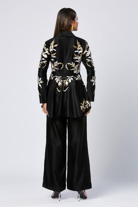 Black peplum jacket featuring silk thread and sequin embroidered floral motifs. Paired with a plain flared pant with an elasticated waistband.
