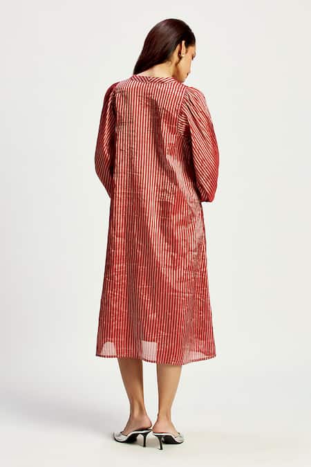 Red Chanderi Silk, Cotton Embroidery, Cut Work Flynn Stripe Pattern A-line Dress