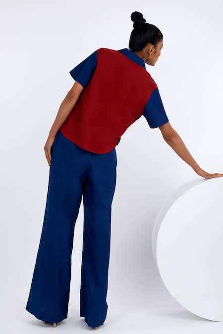 Indigo handloom cotton shirt featuring a notched lapel collar and half sleeves. Paired with wide-legged pant showcasing stripe placement print and side pockets.