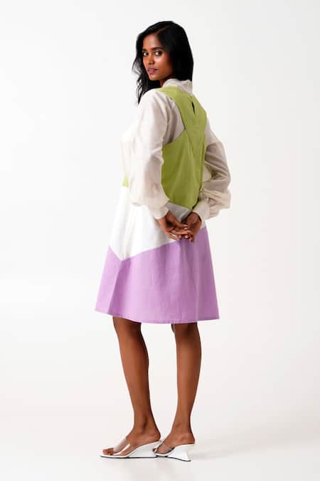 Multi color woven dress featuring floral patchwork and color blocking detail. Paired with a contrasting solid shirt with a front tie-up design.