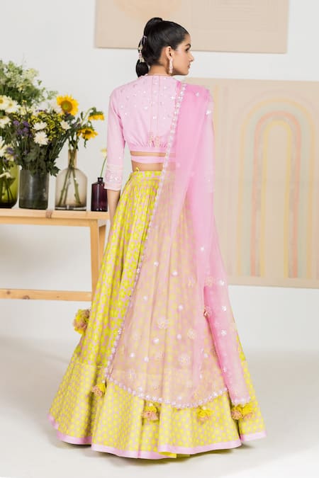 Spring green floral print lehenga with floral side tassels. Paired with lilac wrap style choli and silk organza dupatta