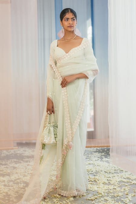 Meadow mist sheer saree with floral embroidery and sequin embellishment. Comes with blouse.