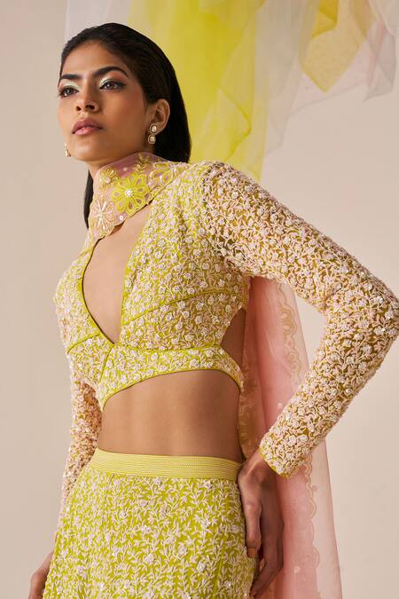 Green blouse featuring all-over hand embroidery with sequins, beads, and knots. Paired with a sharara and a floral cutwork dupatta.