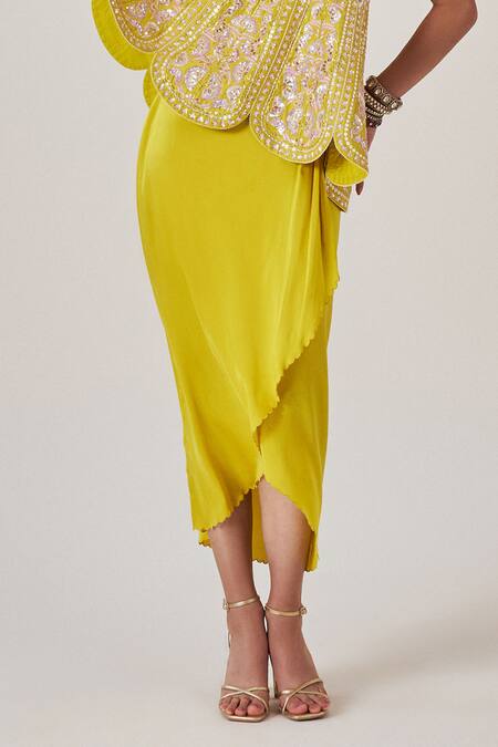 Ochre yellow scallop trimmed one shoulder top featuring all over hand embroidery with sequins and thread work. Paired with a coordinating skirt for a complete look.