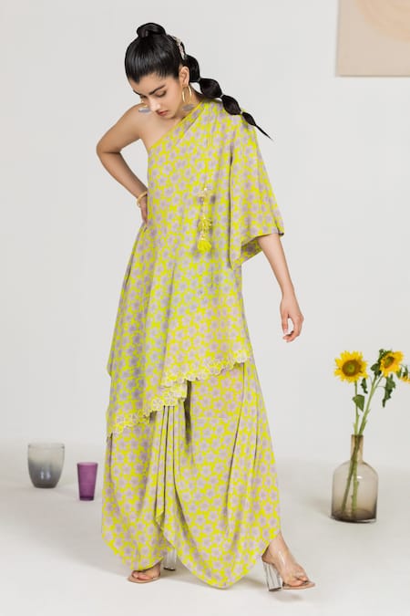 Spring green periwinkle print one shoulder tunic with asymmetric hem. Paired with a printed dhoti skirt.