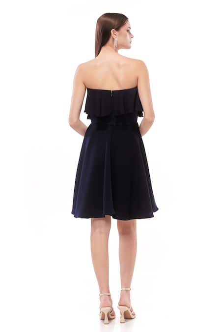 Navy blue fit-n-flare tube dress featuring a georgette ruffle at the upper body and hand-studded panels on the neck