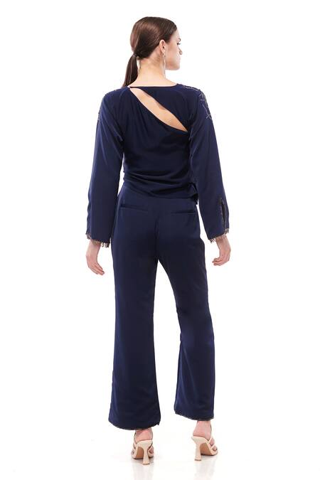 Blue V-neck top featuring hand-beaded lotuses on the shoulder and a cowl cut-out back. Paired with pants embellished with beadwork along the borders and front slits.