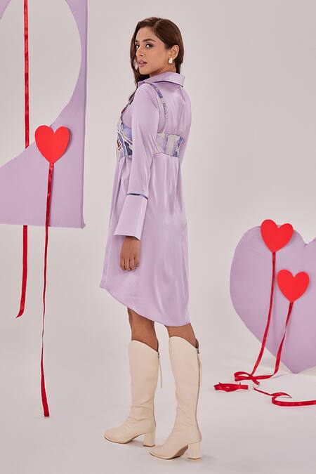 Purple Satin Beads, Sequins Collared, Round Neck Lucy Saeng Shirt Dress