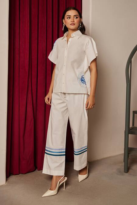 White Cotton Beads Collared Square Kaftan Shirt And High Waist Pants Set
