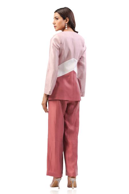 Multicolor tri-color panel blazer featuring stylish square cut-outs in the front. Paired with straight pants, this set is designed for a chic look.