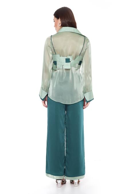 Green Organza, Satin Square Neck, Collared Sage Faye Bodice Top And Pants Set