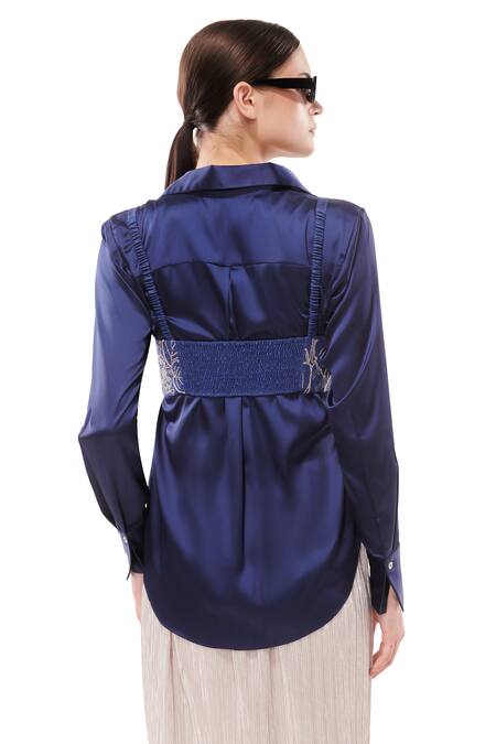 Blue Satin Beads Collared Sapphire Saeng Bodice Shirt