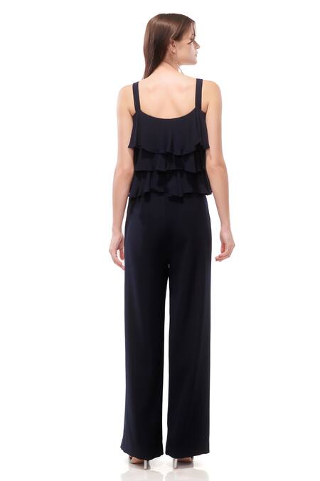 Navy blue sleeveless layered frill top featuring hand embellishments with drop shaped rhinestones at the neck. Paired with high waisted wide leg pants, both crafted from a smooth, lightweight georgette and polyester blend.