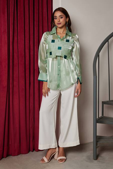 Green bodice top featuring an intricately crafted design with square motifs. Paired with a button-down organza shirt with contrasting double cuffs.