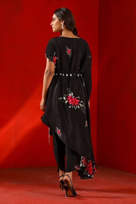 Black Crepe Chains Cowl Neck Magnolia Print Kaftan Kurta And Tulip Pant Set