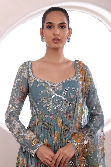 Grey anarkali featuring floral pattern with sequin and mirrorwork embellishments. Paired with a matching dupatta showcasing tasselled details.