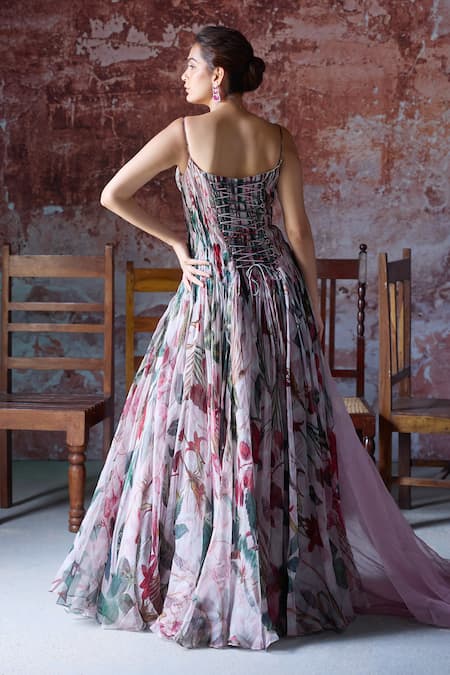 Soft pink anarkali featuring floral print with embroidered details and ruched waist