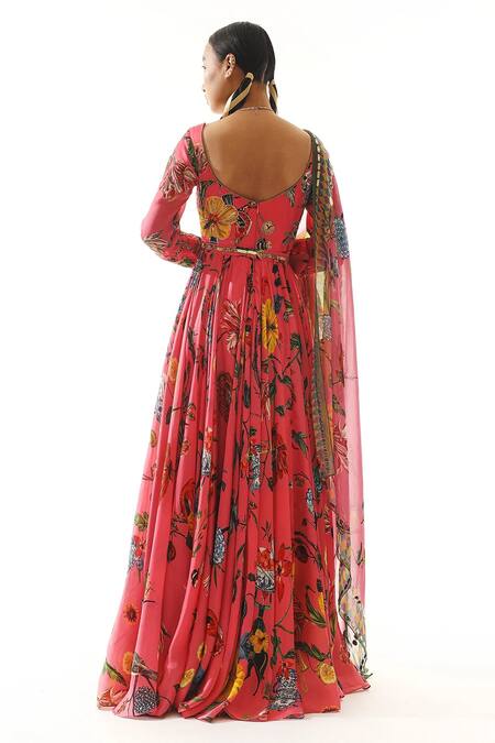 Pink Anarkali featuring all-over multicolor floral print and sequin work on the bodice. Paired with a printed dupatta adorned with a mirror work border.