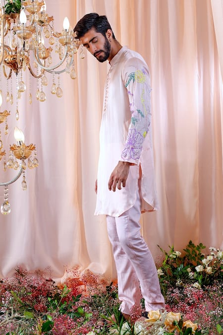 Rose quartz kurta with floral embroidery on sleeves. Paired with pant.