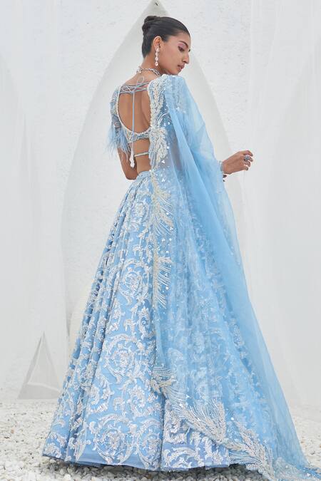 Powder blue lehenga featuring hand embroidery in spiral abstract pattern with sequins, cutdana, beads, and stone work. Paired with a padded blouse adorned with feather embellishments and a dupatta showcasing abstract hand embroidery.