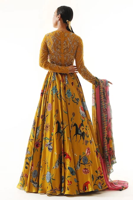 Gold Anarkali featuring floral print with bead embroidery on the neckline. Paired with a printed dupatta and embellished waistband.