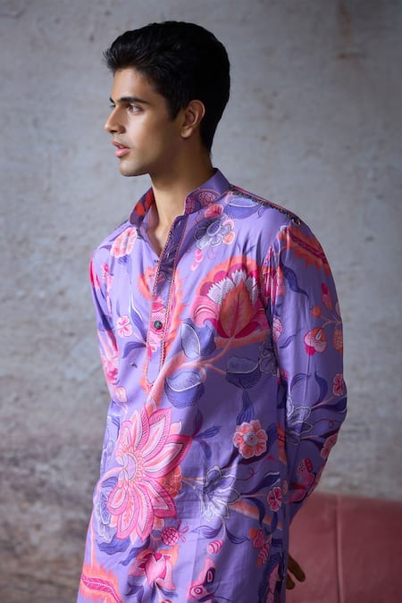Lilac kurta featuring full sleeves and a Mandarin collar with an all-over Phool garden print. Paired with matching pants for a complete look.