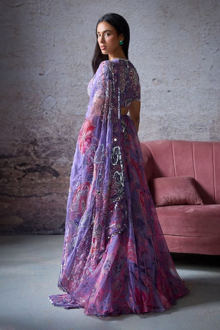 Purple Organza Sequins, Beads Open Neck Somya Bloom Print Lehenga Set