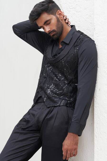 Black sleeveless waist coat featuring a curved shawl collar and all-over tonal sequin swerve embroideries. Paired with matching black pants for a complete look.