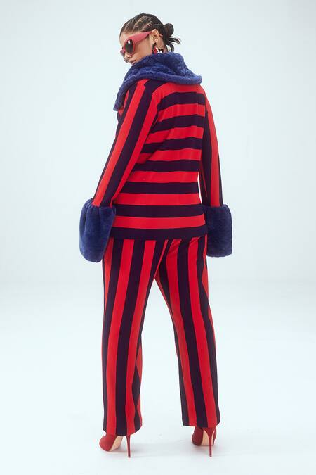 Red & blue knitted jacket featuring a color block stripe pattern and a contrast fur shawl collar. Paired with matching striped straight fit pant.