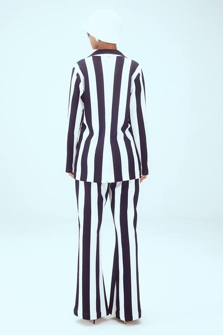 Blue and white knitted jacket featuring a notched lapel collar and front button placket. Paired with striped straight fit pants and a flower applique work belt.