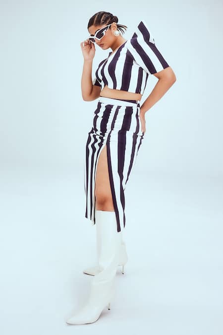Blue and white striped crop top featuring structured sleeves and an inverted V neck. Paired with a matching striped skirt with a side high slit and concealed zip closure.