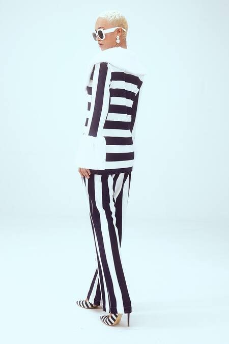 White Shawl Neck Striped Knitted Jacket And Pant Set