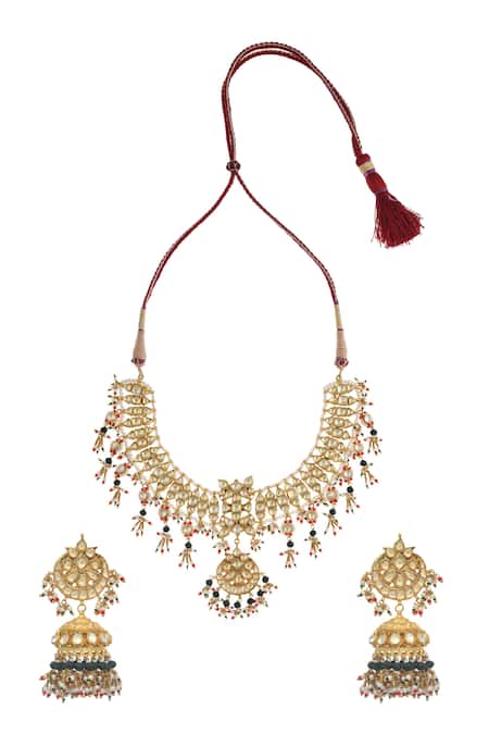 Gold necklace featuring floral, crescent, and geometric cut work design with stone, multi-color beads, and pearl embellishments. Paired with embellished jhumka earrings for a complete set.