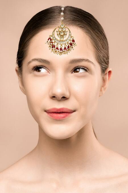 Gold polish maangtikka featuring a crescent moon-floral motif adorned with a pearl string and red beaded clusters